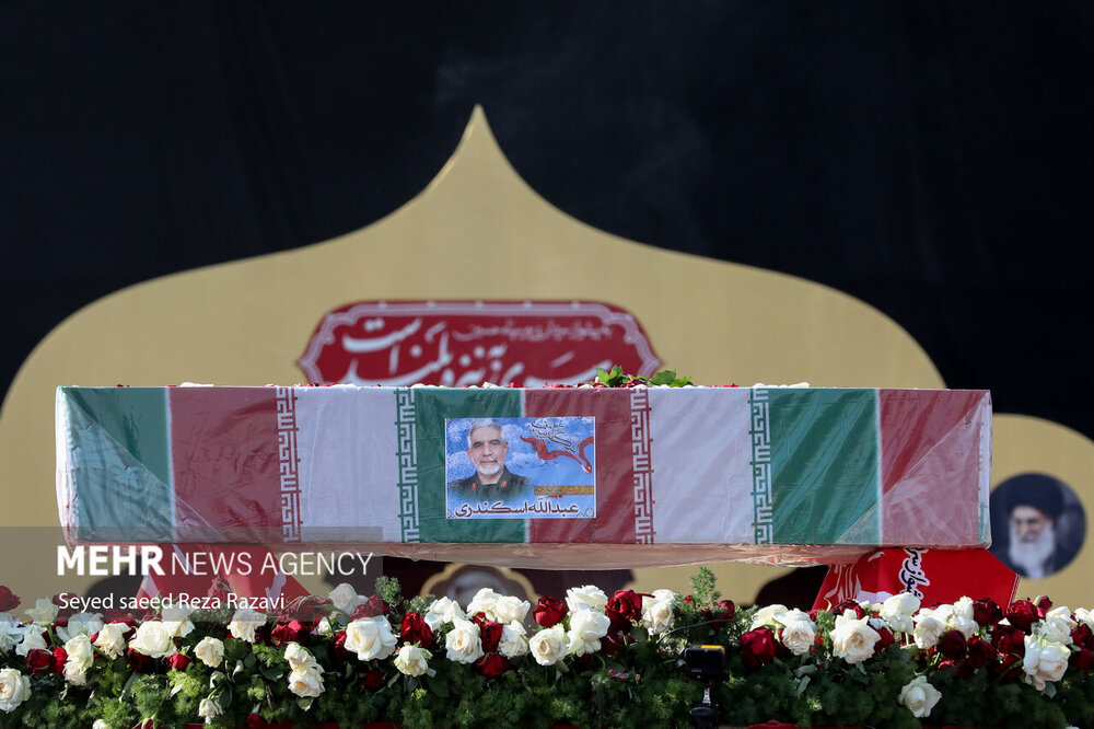 همسر شهید اسکندری در این مراسم، طی سخنانی گفت: خدمت به نظام، انقلاب اسلامی و احساس مسئولیت و دفاع از حریم مسلمین در برابر تروریستهای داعشی از شاخصههای شهید اسکندری بود. او میگفت اگر نیاز باشد برای دفاع از اسلام تا دورترین نقطه از جهان خواهم رفت و آنقدر میجنگم تا شهادت را به دست بیاورم.