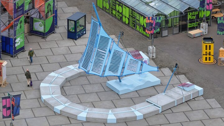 پاویون اومبرا با سایهبان شبیه بادبادک، نهتنها از نظر زیباییشناسی چشمنواز است، بلکه عملکردی چندگانه دارد. این سایهبان بهگونهای زاویهدار طراحی شده است تا سایهای خنک بر فضای داخلی بیندازد که نیمکتهای دایرهایشکل برای نشستن و تعامل بازدیدکنندگان تعبیه شدهاند. رنگ آبی آسمانی پارچه، در کنار بافت سبک و شناور آن، حس آرامش و سبکی را در فضا القا میکند.