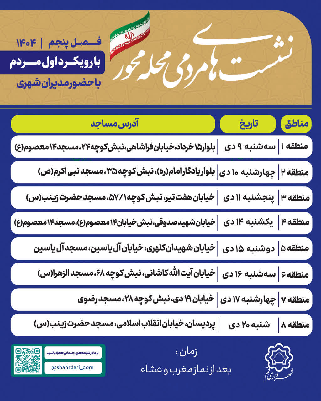 مدیرکل ارتباطات و امور بینالملل شهرداری قم در پایان گفت: نشست منطقه پنج روز دوشنبه ۱۵ دیماه در مسجد آل یاسین واقع در خیابان شهیدان کلهری، خیابان آل یاسین، نشست منطقه شش روز سهشنبه ۱۶ دیماه در مسجد الزهرا(س) واقع در خیابان آیتالله کاشانی، نبش کوچه ۶۸، نشست منطقه هفت روز چهارشنبه ۱۷ دیماه در مسجد رضوی واقع در خیابان ۱۹ دی، نبش کوچه ۲۸ و نشست منطقه هشت نیز روز بیستم دیماه در مسجد حضرت زینب(س) واقع در پردیسان، خیابان انقلاب برگزار خواهد شد و از همه شهروندان دعوت میشود با حضور در این نشستها، مطالبات خود را مطرح کنند.